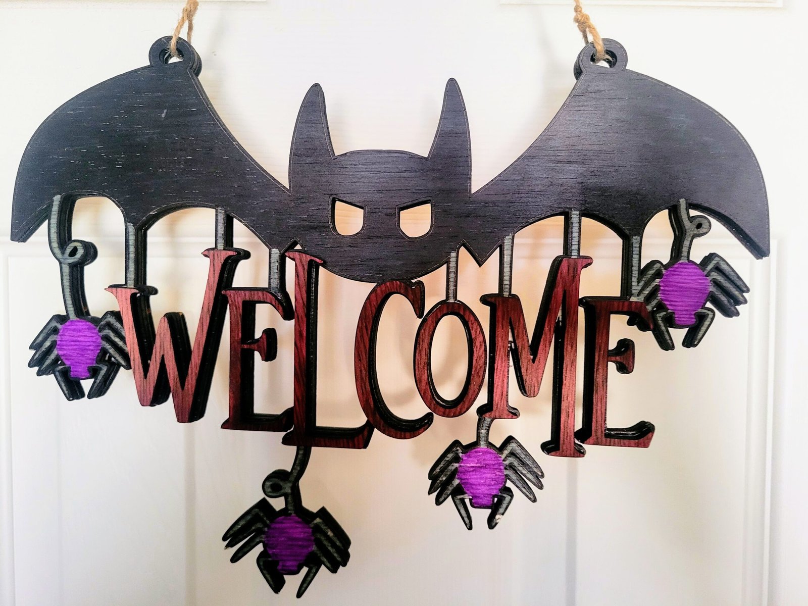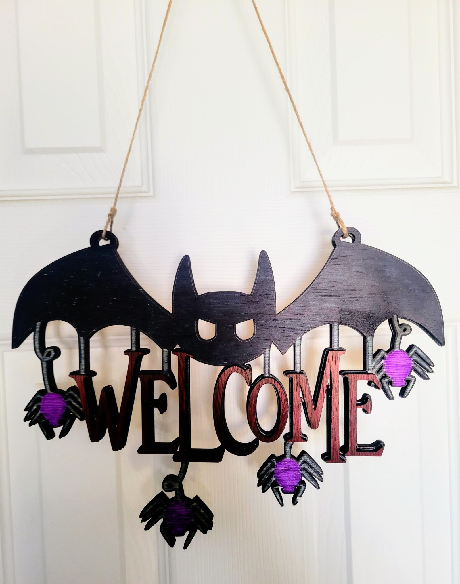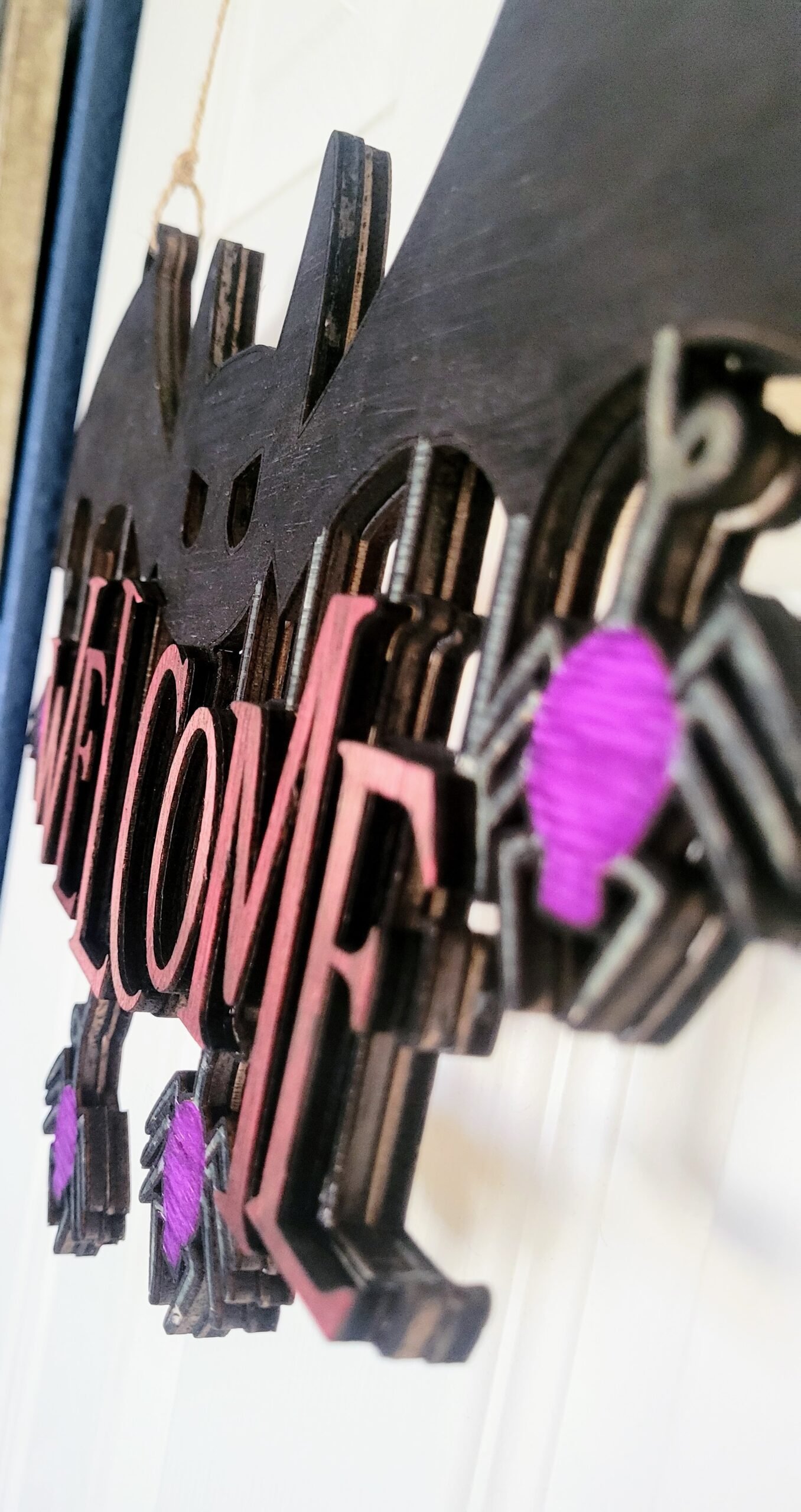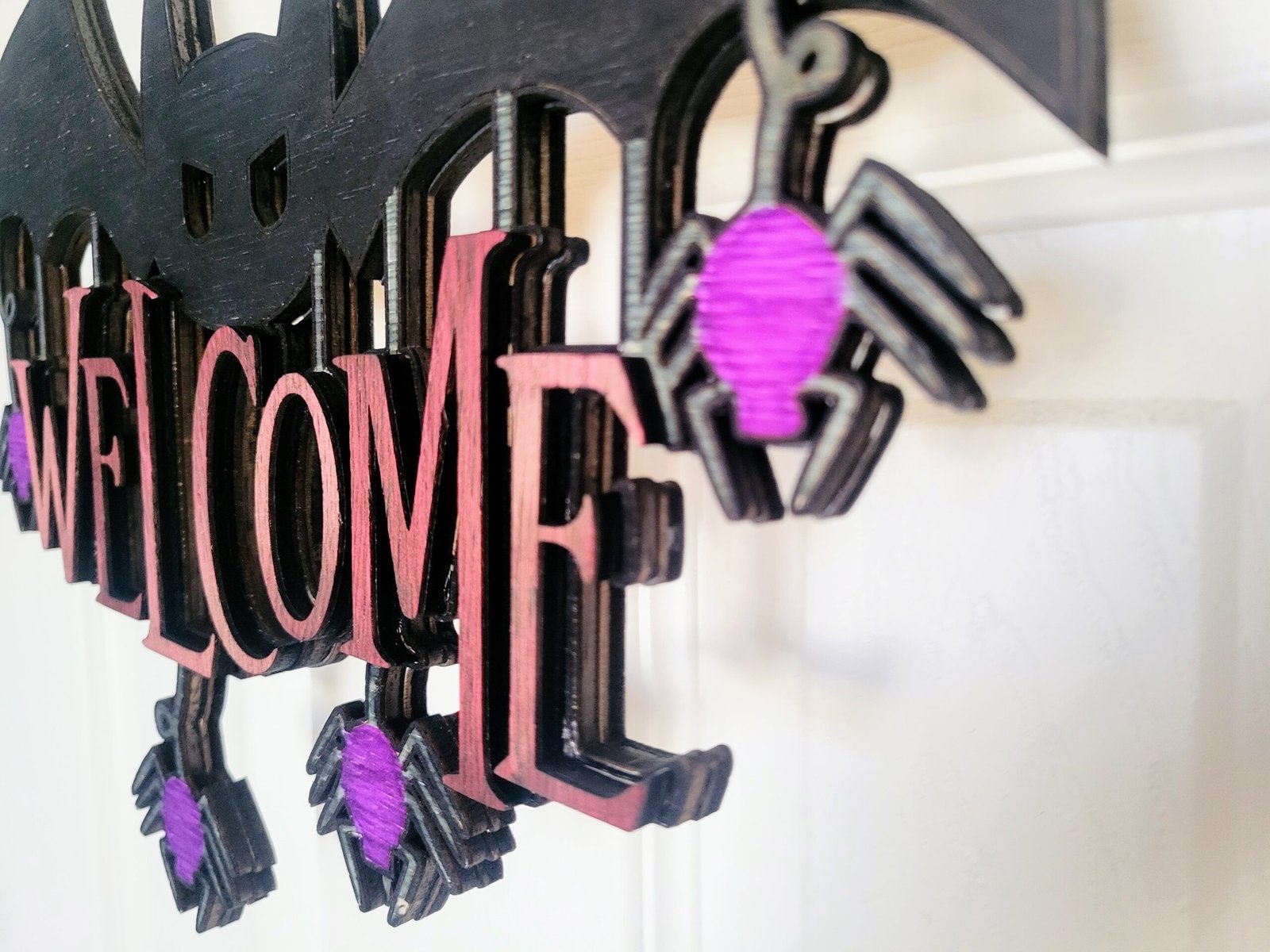 This door hanger is a fun way to greet (or warn off?) guests. It is a layered piece, which adds a nice depth and elevates the visual appeal. The bat, spiders and webs are composed of two layers, and the “welcome” portion is made from three layers.