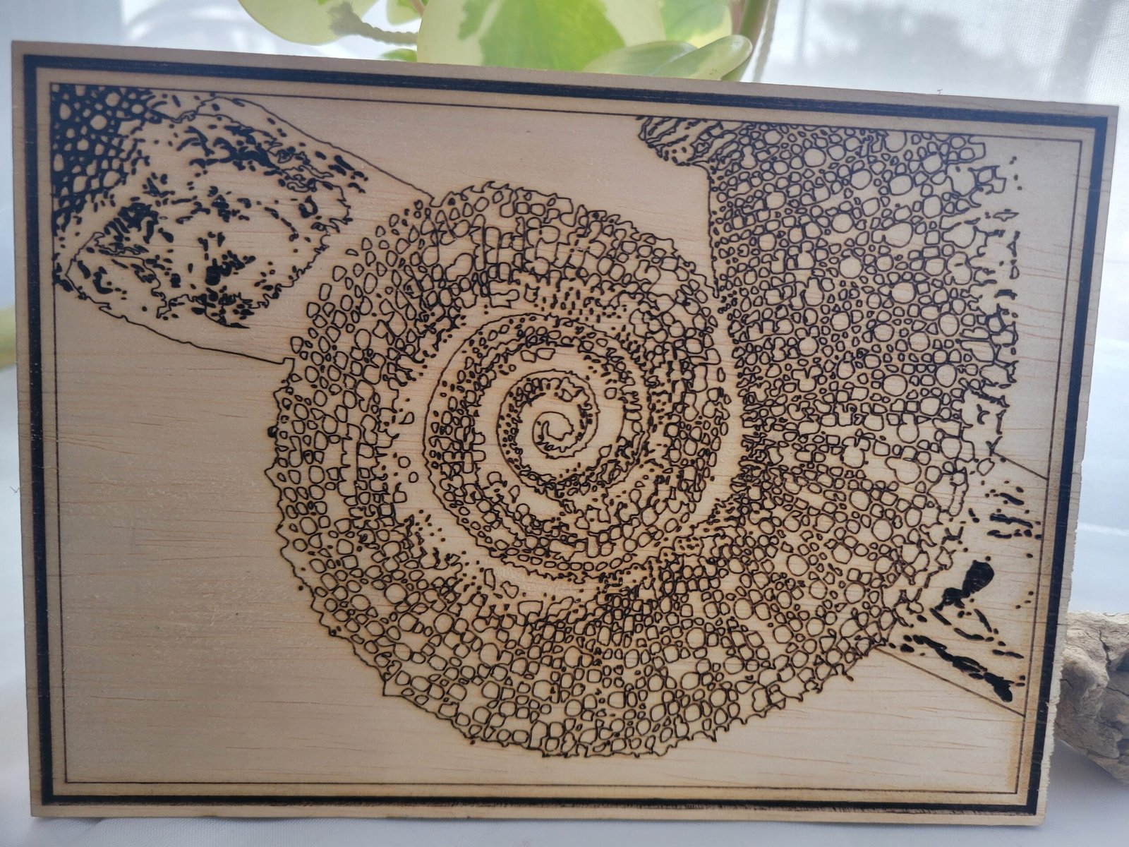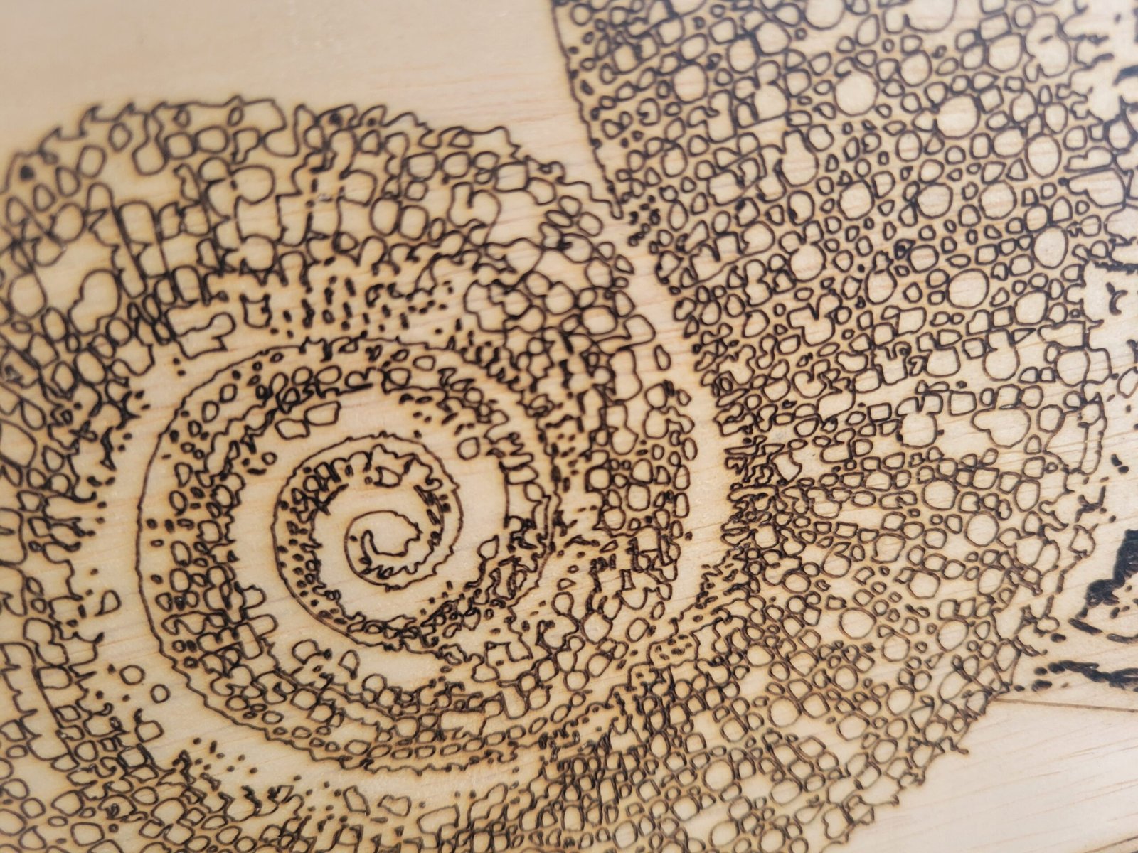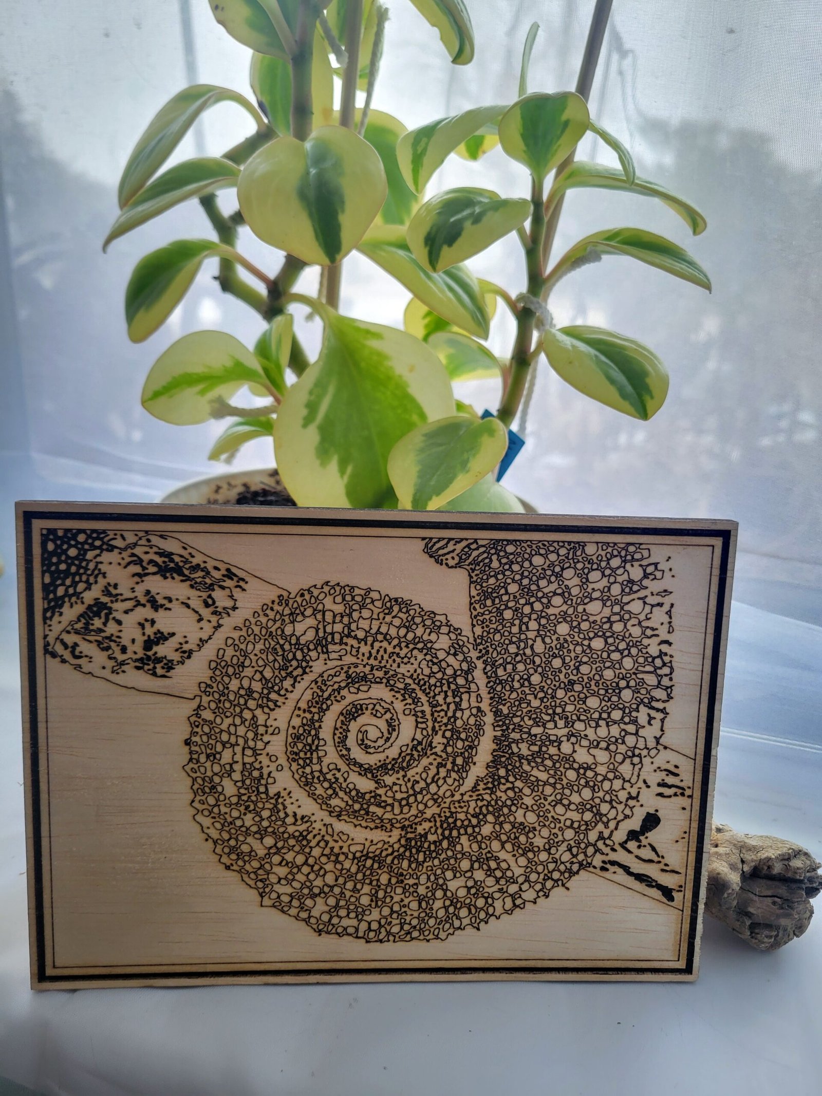 This piece shows a curled chameleon tail in front of a branch. The tail is created entirely from fine detail linework, and the branch is burnwork.